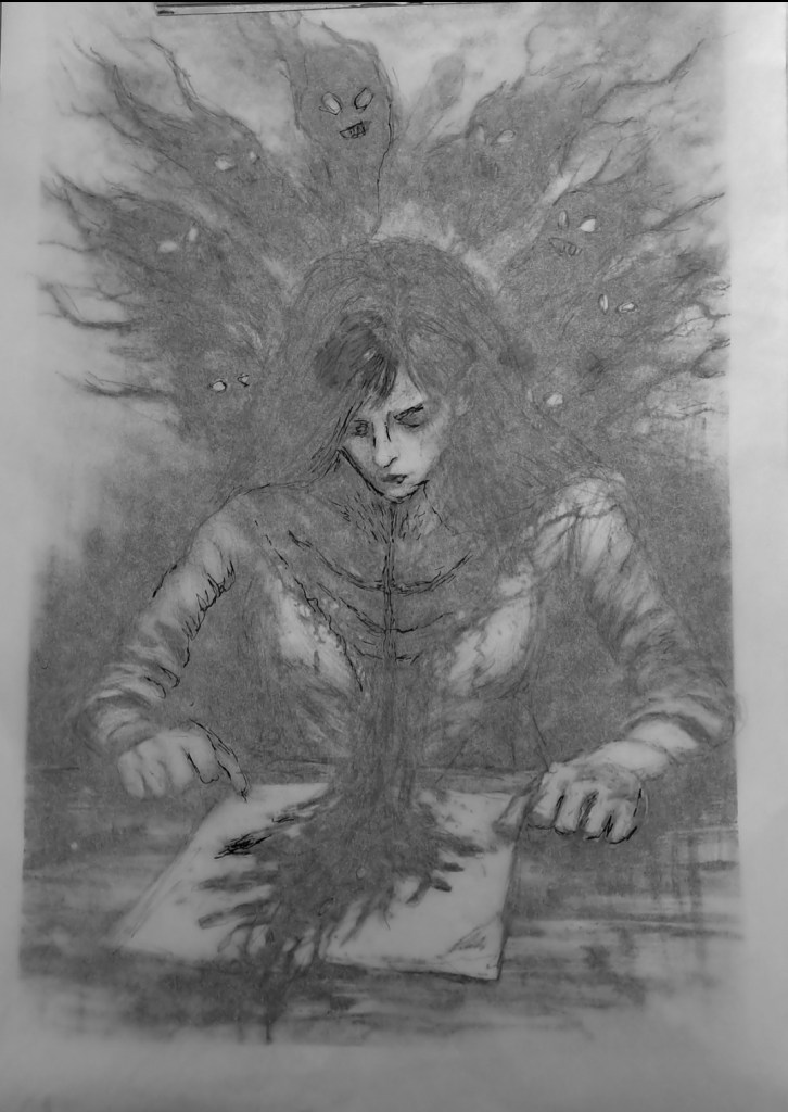 The drawing depicts a figure bleeding from within—sharing something essential and intimate—while behind her unfolds a world of falsification, betrayal, and cynicism. The voices and faces in the background form a system that watches, consumes, and ultimately looks away