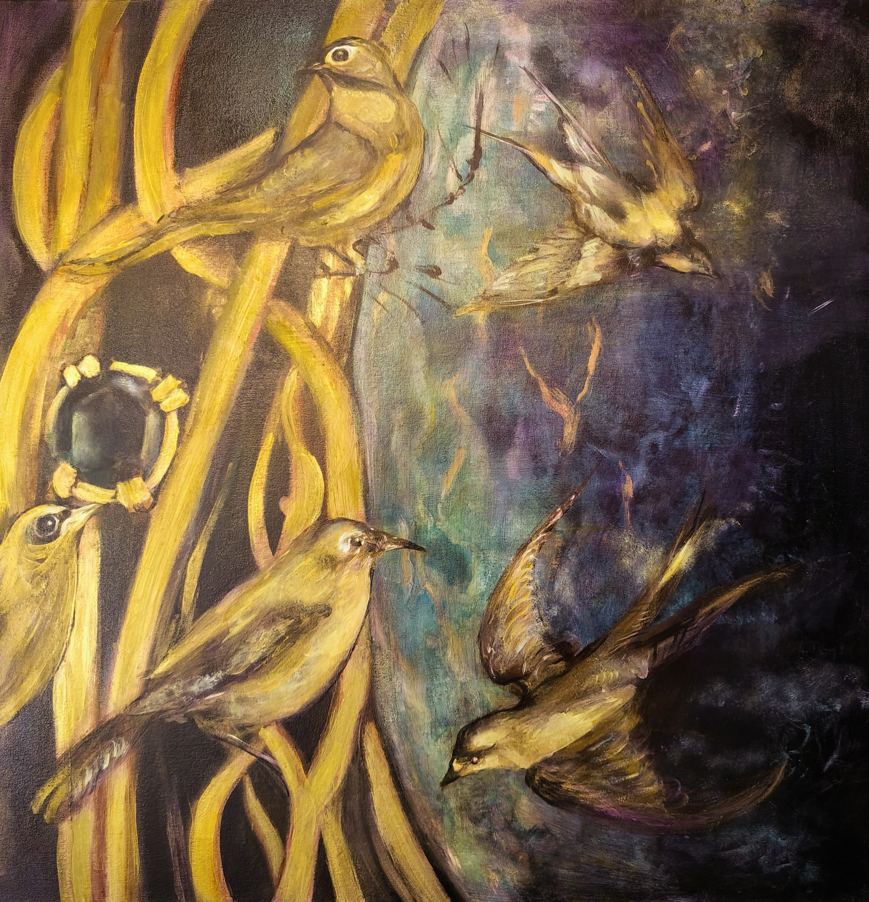 In Song of Creation, gold and sapphire merge into a cosmic field in which songbirds in motion transform into prayer—a visual hymn to creation itself